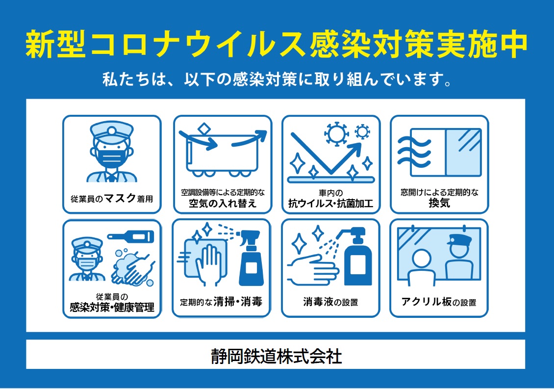 静鉄電車では、お客様に安心してご利用いただくため、「鉄軌道事業者における新型コロナウイルス感染症対策に関するガイドライン」に基づいて、感染防止対策を実施しております。