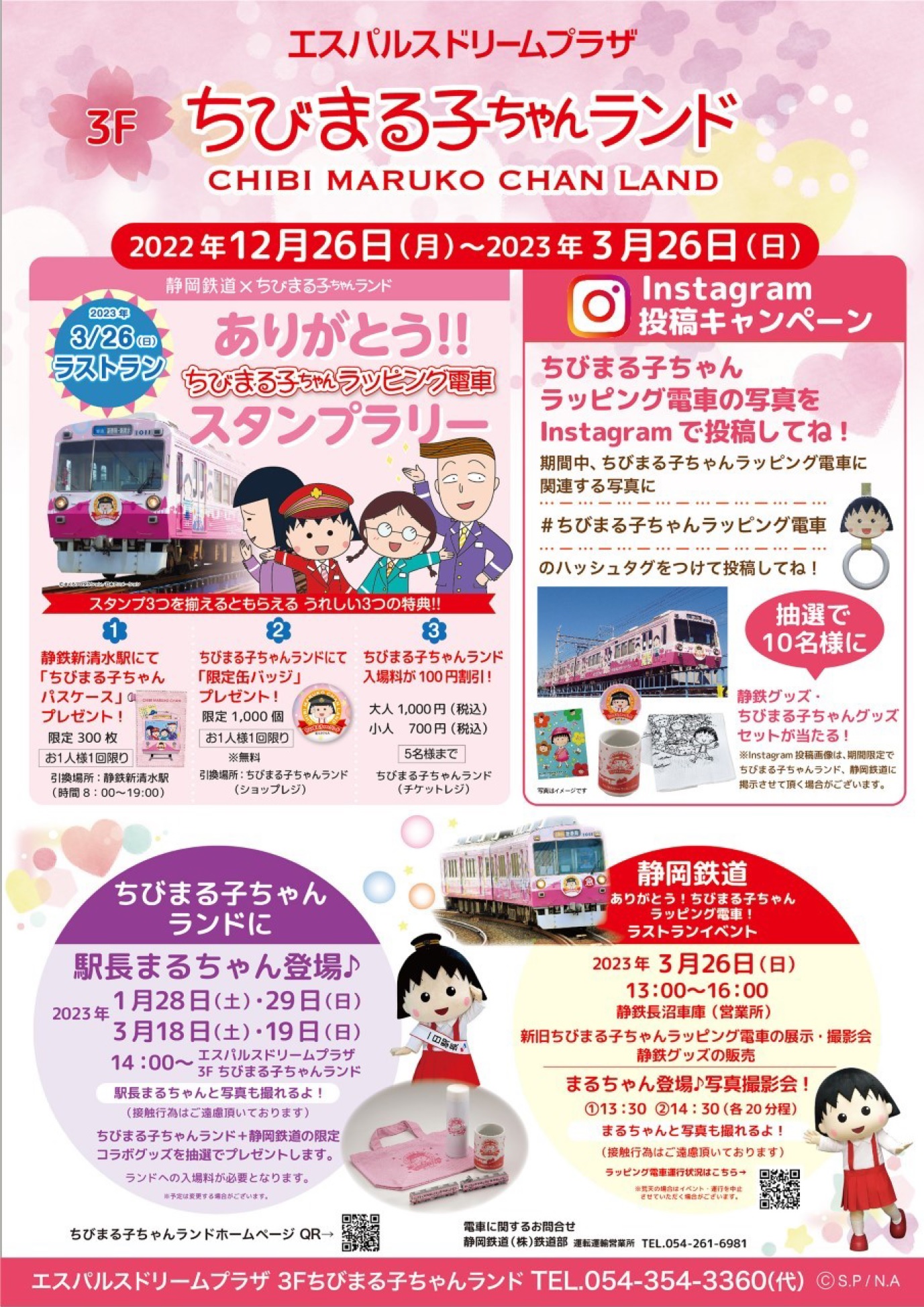 | 内容 | 各箇所に設置されたスタンプを3つ揃えた方に、以下の特典がございます 特典1.ちびまる子ちゃんランドで提示 ・ 限定缶バッジをプレゼント(限定1000個) ・ ちびまる子ちゃんランドの入場料100円割引 特典2.静鉄 新清水駅で提示 ・ ちびまる子ちゃんパスケースをプレゼント(限定300個) |
