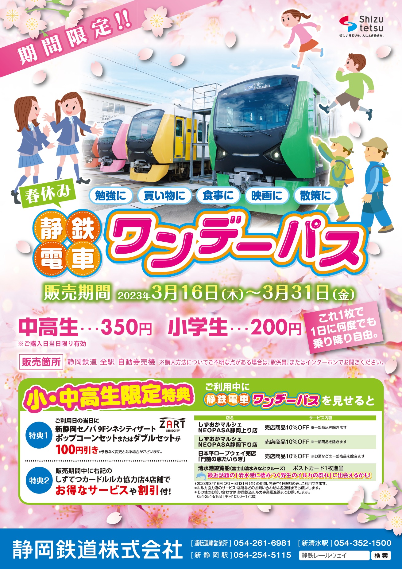 静鉄電車では、春休み期間中に購入当日限定で1日電車が乗り放題となるお得な乗車券「春休みワンデーパス」を小学生・中学生・高校生を対象に販売いたします。