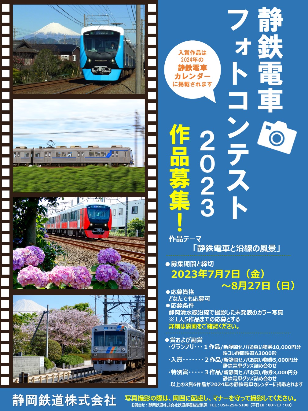 | 賞 及び 副賞 | ・グランプリ・・・1作品 新静岡セノバお買物券10,000円分 鉄コレ静岡鉄道A3000形 ・入賞・・・・・・2作品 新静岡セノバお買物券5,000円分 静鉄電車グッズ詰め合わせ ・特別賞・・・・・3作品 新静岡セノバお買物券3,000円分 静鉄電車グッズ詰め合わせ |