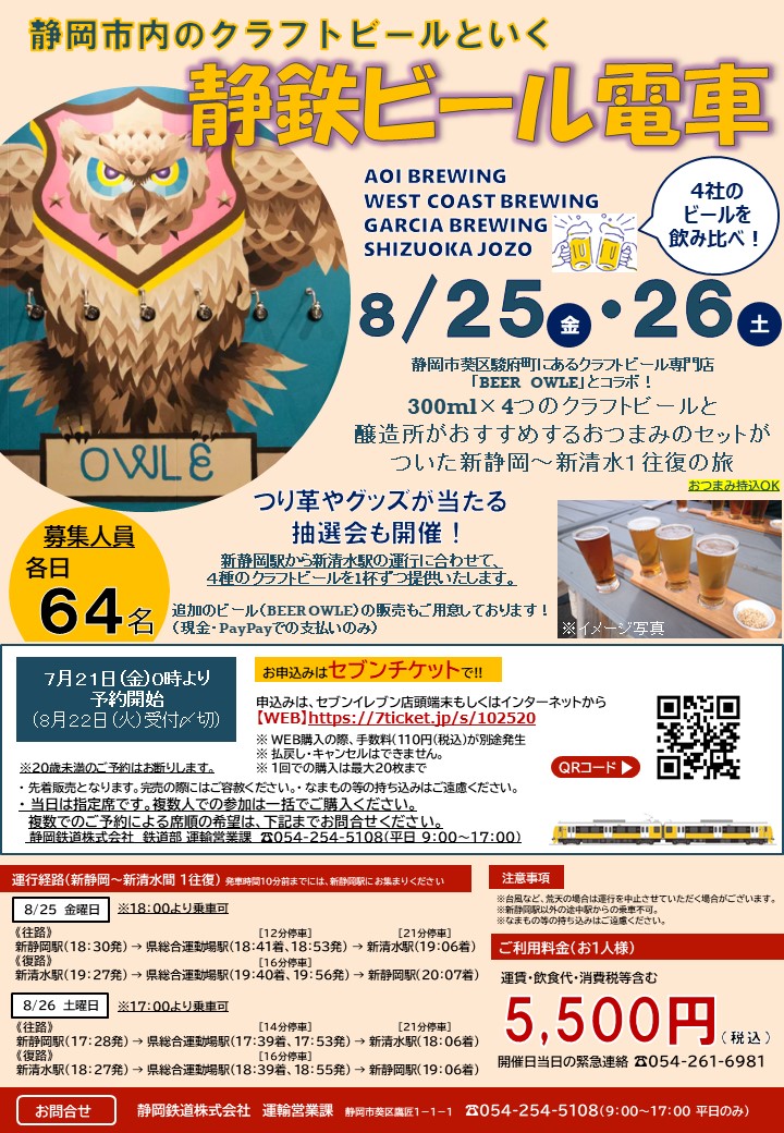 8月25日(金)、26日(土)の「静鉄ビール電車」はおかげさまで完売いたしました。多くの皆様にお申込みいただき誠にありがとうございます。なお、静鉄電車では今後も様々なイベントを実施する予定です。お楽しみに!