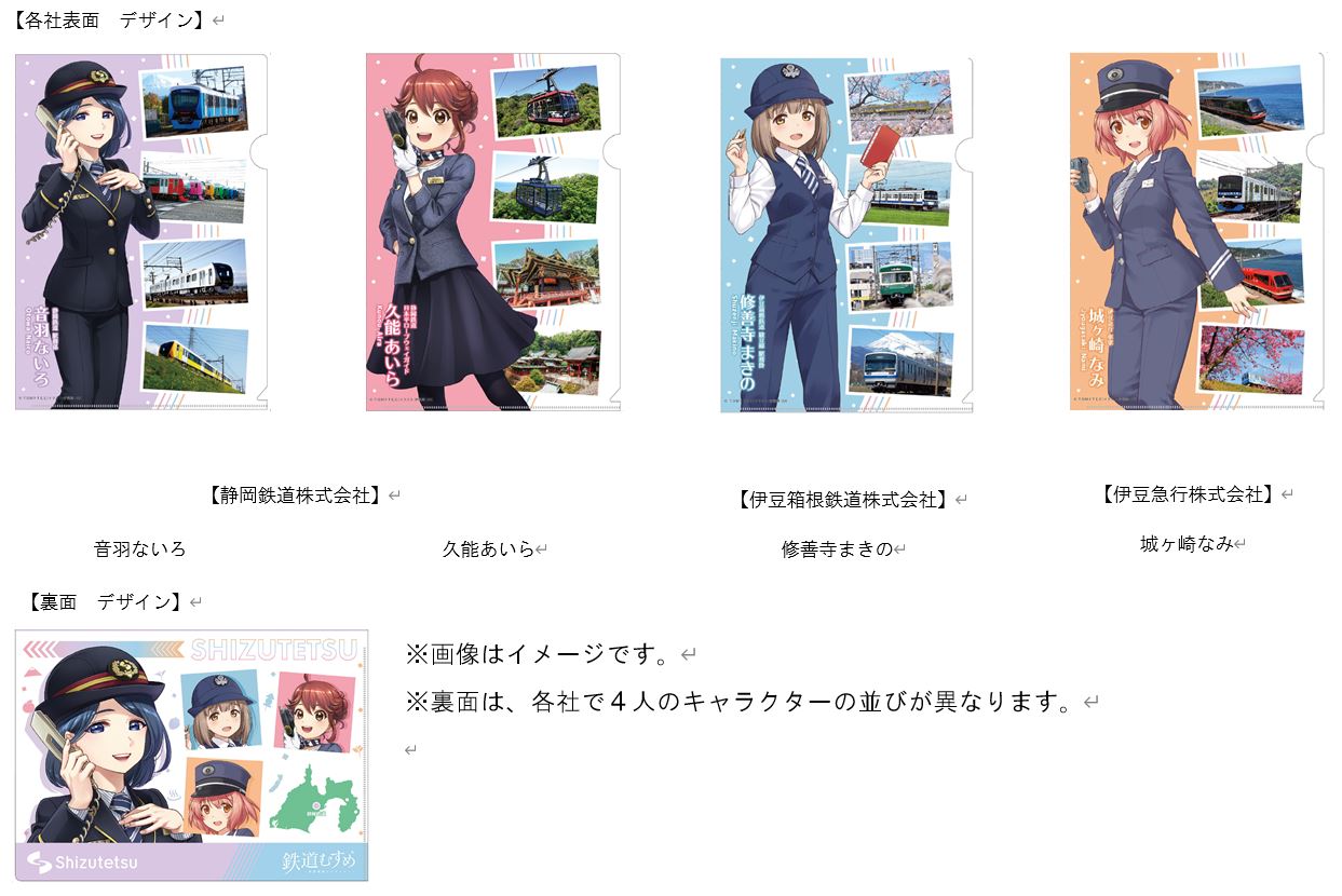 静岡鉄道は「音羽ないろ」「久能あいら」、伊豆箱根鉄道は「修善寺まきの」、伊豆急行は「城ヶ崎なみ」のクリアファイルを全4種類発売します。