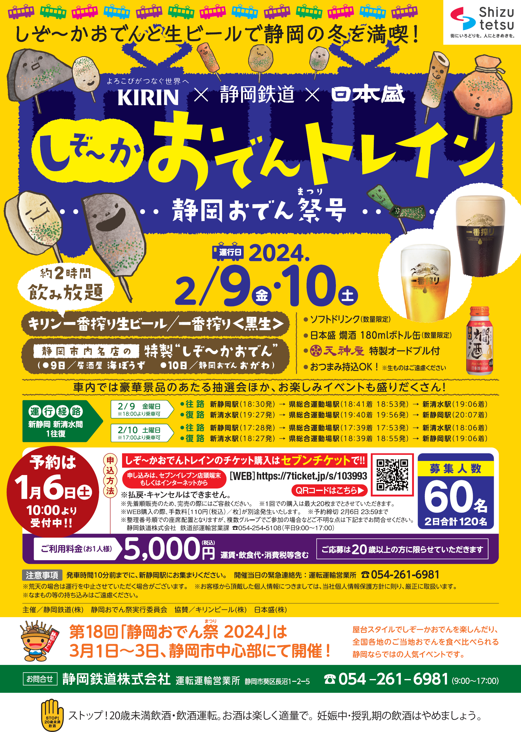 おでんトレインでは、市内名店の特製「しぞーかおでん」やビールの飲み放題の他、豪華景品があたる抽選会などお楽しみイベントも盛りだくさんとなっております。(予約制)