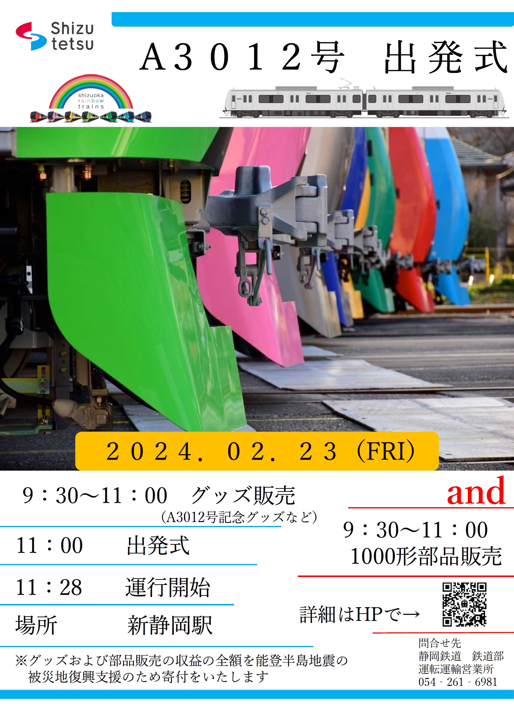 | スケジュール | 9:30~11:00 記念グッズ販売 1000形部品販売 10:00 A3012号展示 11:00 出発式 11:28 A3012号運行開始(臨時便1往復) 新静岡駅発 12:04 新清水駅発 |