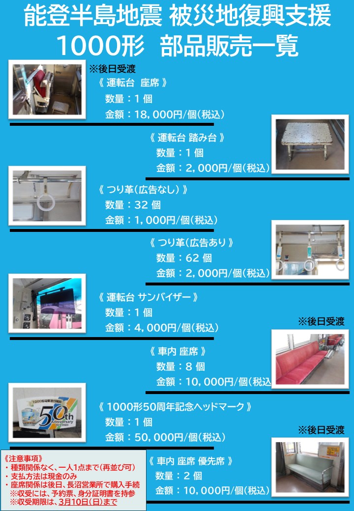 | 販売 | 記念グッズ ・A3000瓦煎餅(8枚入り) 600円 ・下敷き A3012号デザイン A3000シリーズデザイン 各200円 ・1日フリー乗車券(限定デザイン、ポストカード付) 700円 ※全て税込み価格です。 1000形部品 ※グッズおよび部品販売の収益の全額を能登半島地震の被災地復興支援のため寄付をいたします。 |