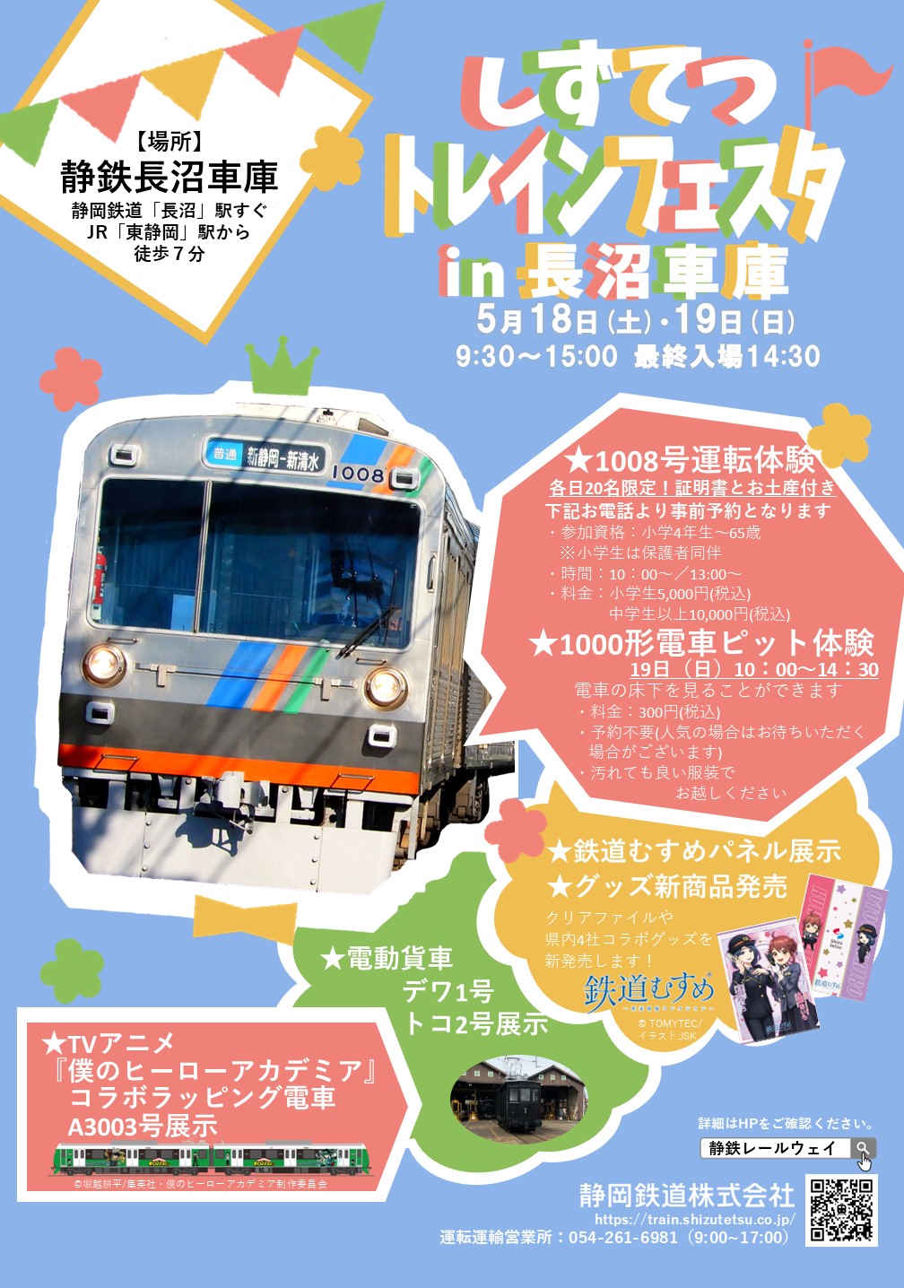 | 内容 | ・1008号運転体験(有料) ・鉄道むすめパネル展示 ・県内鉄道むすめコラボグッズ先行発売 ・静岡鉄道オリジナルグッズ新商品先行発売 ・「デワ1号」「トコ2号」の展示 ・TVアニメ「僕のヒーローアカデミア」コラボラッピング電車 A3003号展示 【19日のみ実施】 ・1000形電車ピット体験(有料) ※当日は雨や風の都合により内容が変更になる場合がございます |