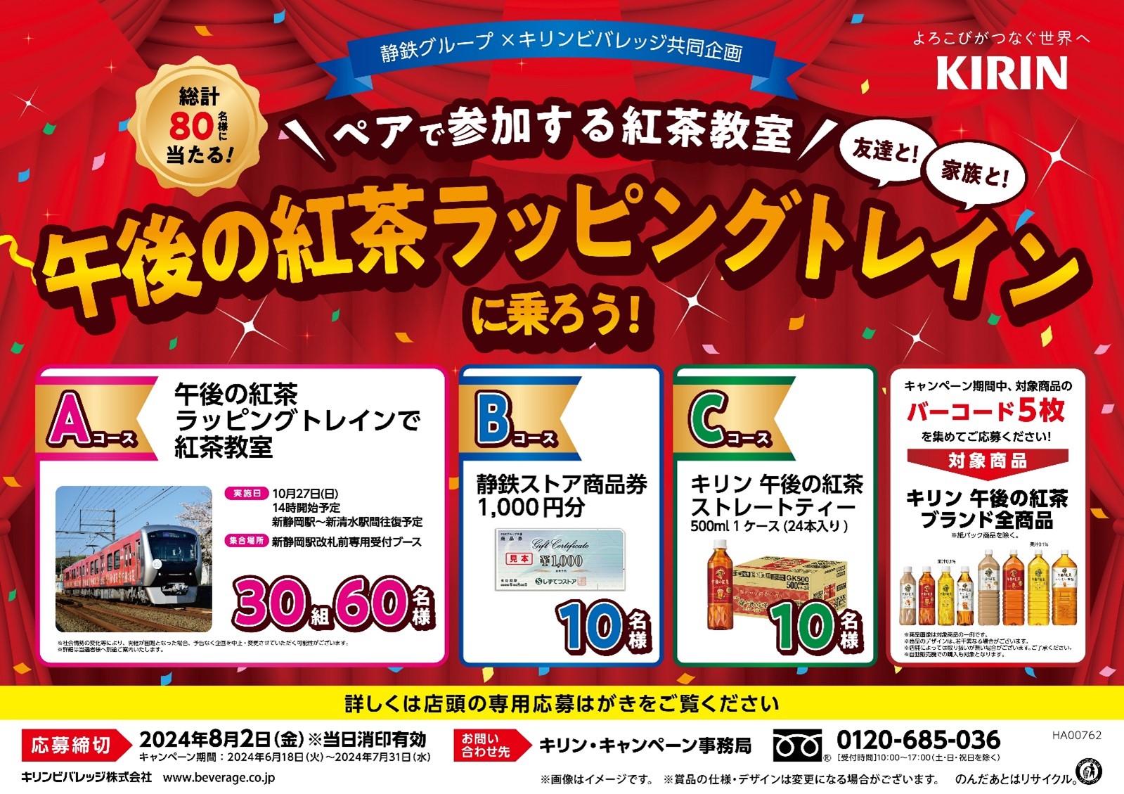 | キャンペーン応募コース | Aコース「午後の紅茶ラッピングトレインで紅茶教室(30組60名様) Bコース「しずてつストア商品券1000円分 (10名様) Cコース「キリン 午後の紅茶ストレートティー500ml 1ケース(24本入り)(10名様) |