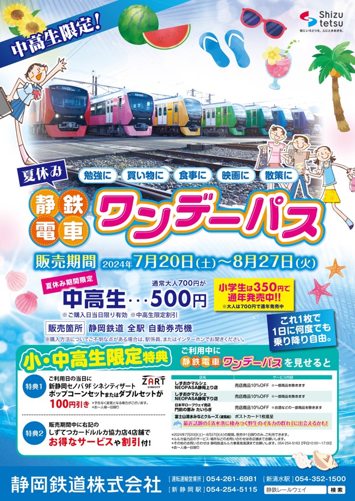 静鉄電車では、夏休み期間中に購入当日限定で1日電車が乗り放題となるお得な乗車券「夏休みワンデーパス」を中学生・高校生を対象に販売いたします。