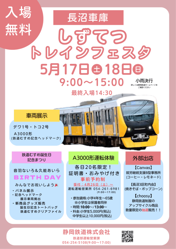 | 開催日時 | 5月17日(土)・18日(日) 9:00~15:00 最終入場(14:30) ※小雨決行(詳しくは静岡鉄道HPをご確認ください) |