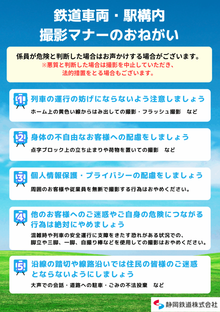 お客様・撮影者様のどなたさまも安全に電車をご利用・撮影していただくため、マナーを守ったご利用をお願いいたします。